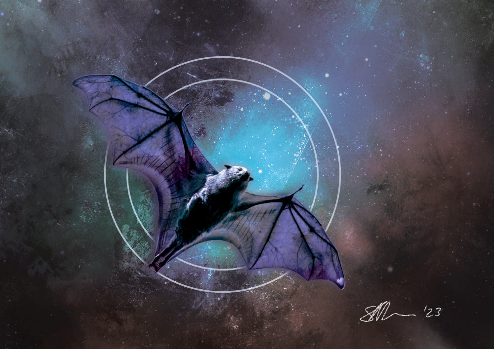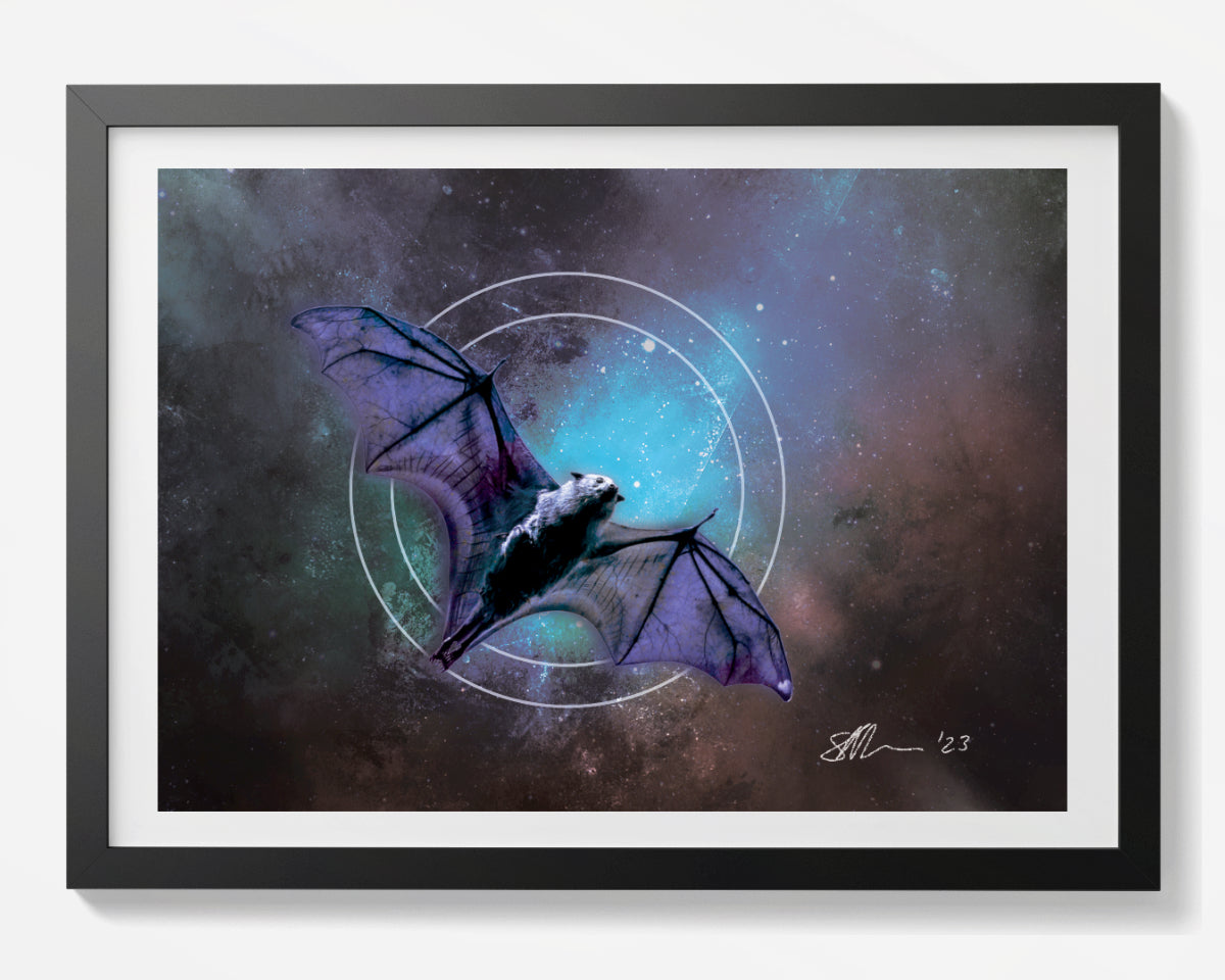 Revel in the enigma of bats with this mesmerising print of black and blue set against a geometric expression of circles representing the moon.