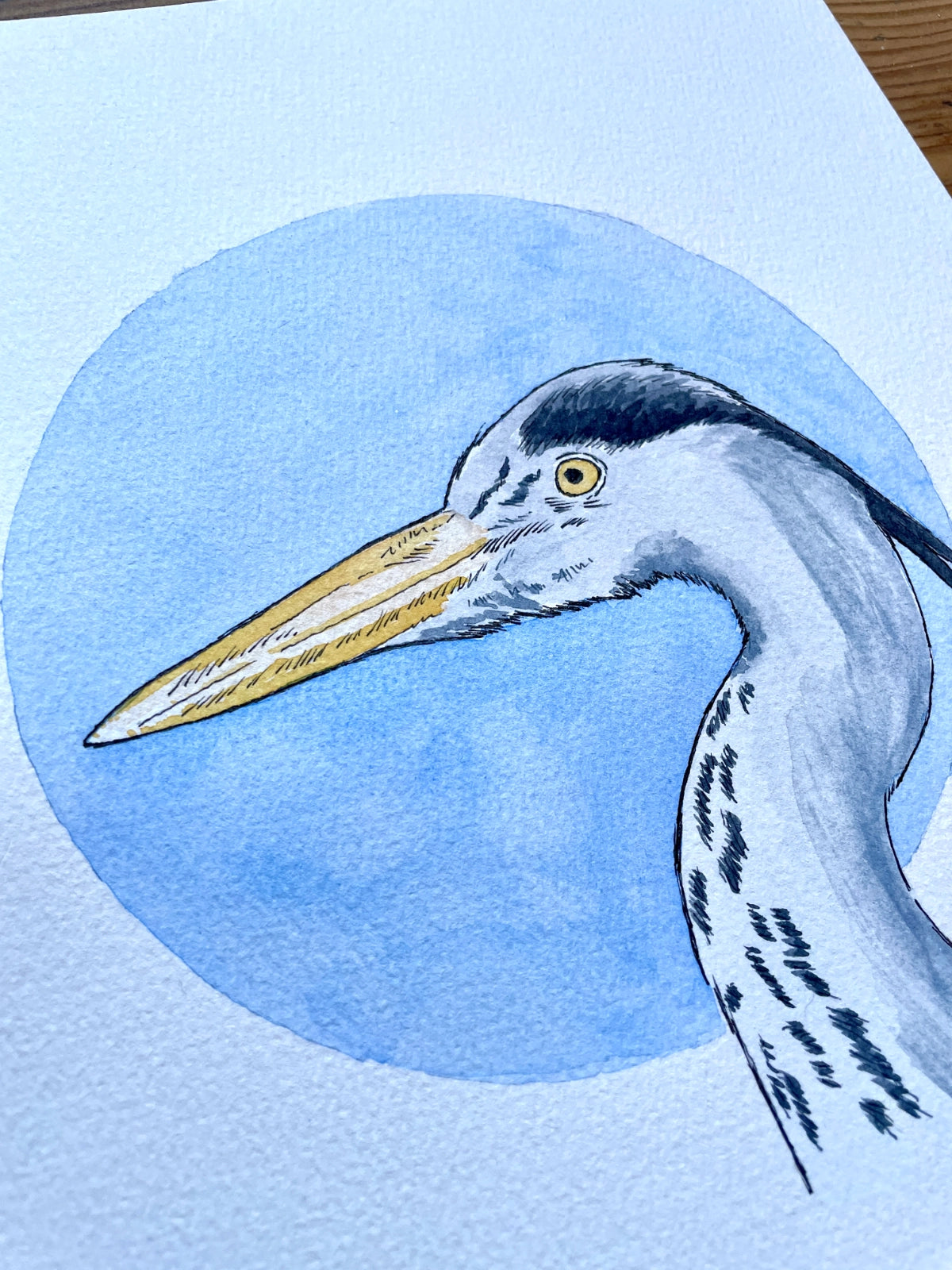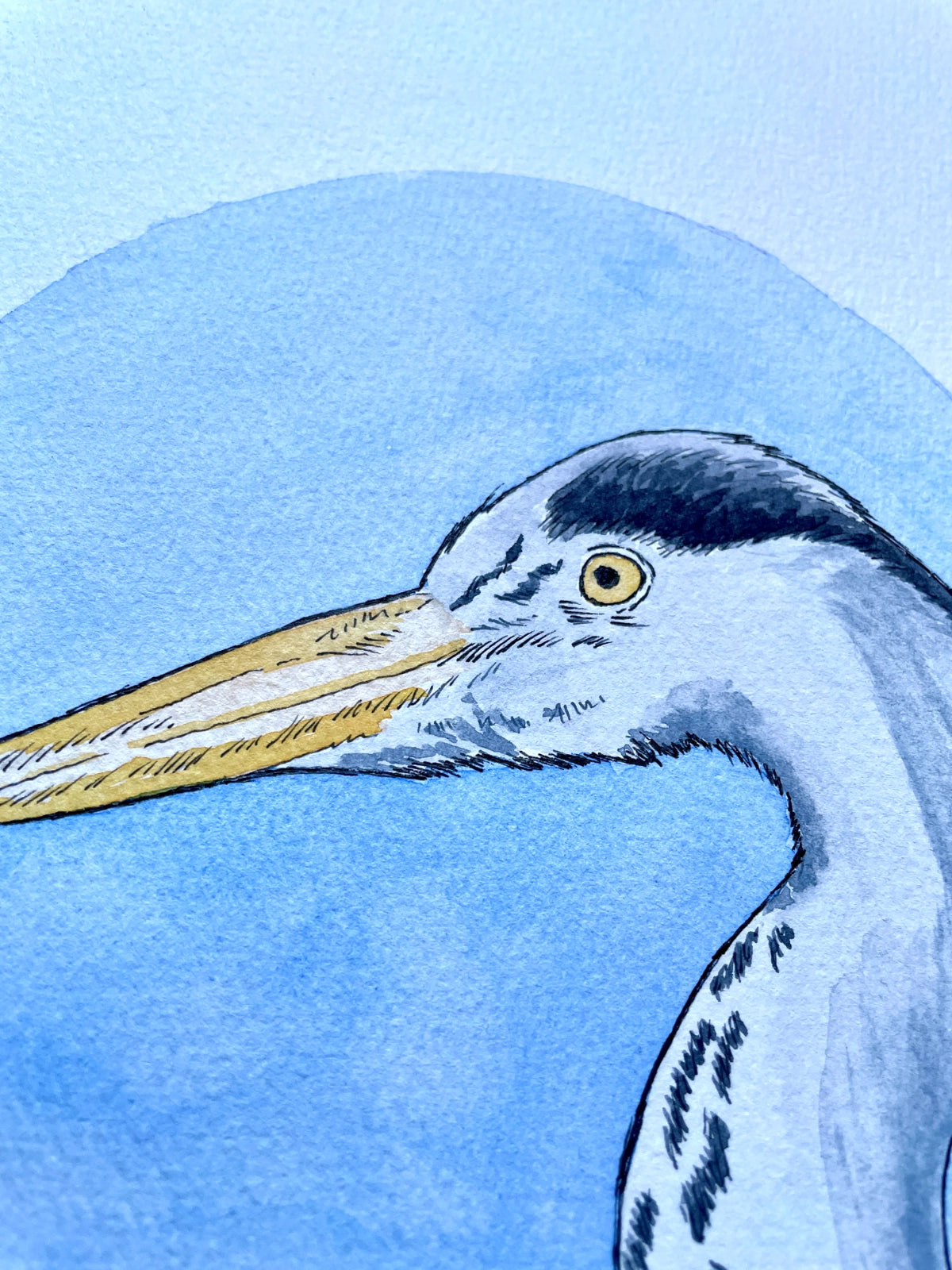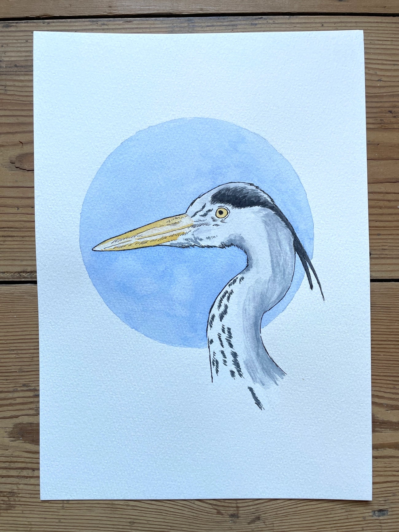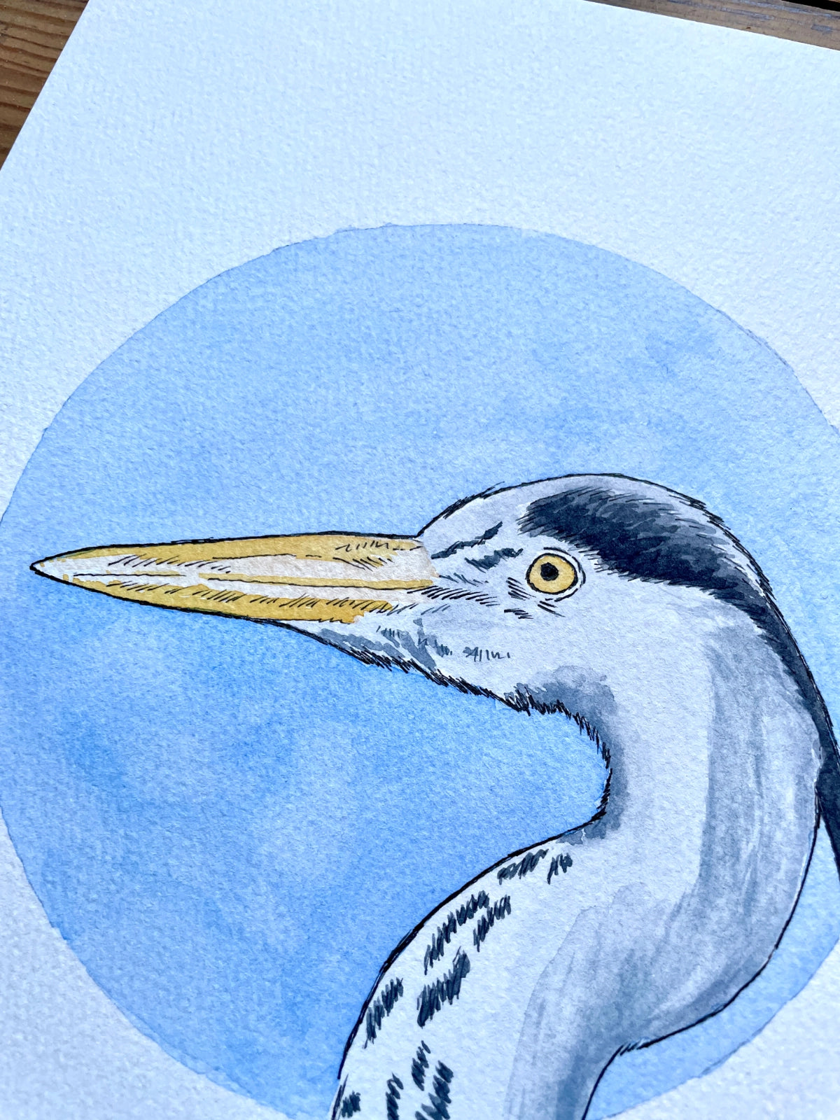 This original watercolour and ink painting was created by hand using soft washes, fine detailing, and a palette of blues and neutrals to echo the heron’s quiet grace. The circular backdrop offers a focal point of calm, anchoring the bird’s poised elegance in a moment of timeless peace.