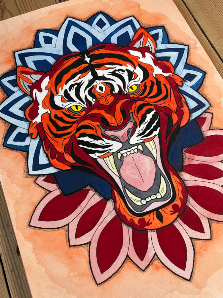 I work with traditional mediums such as watercolour and pen & ink to create paintings and illustrations. These works often have a specific focus on neo-traditional art, incorporating geometric patterns, organic shapes and other elements such as flowers to create a final piece.