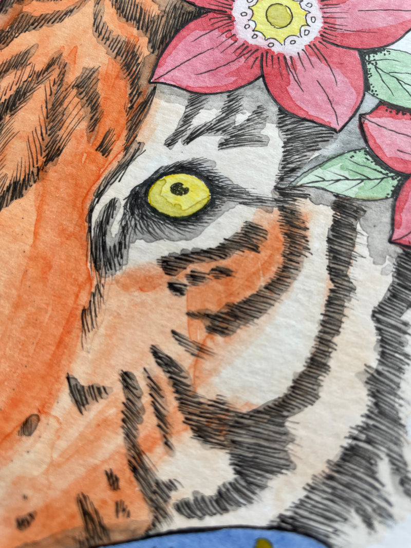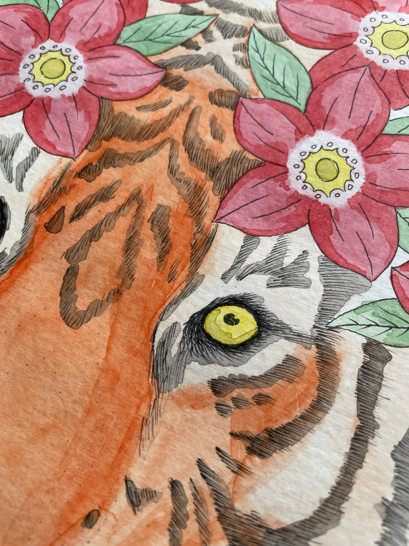I work with traditional mediums such as watercolour and pen & ink to create paintings and illustrations. These works often have a specific focus on neo-traditional art, incorporating geometric patterns, organic shapes and other elements such as flowers to create a final piece.