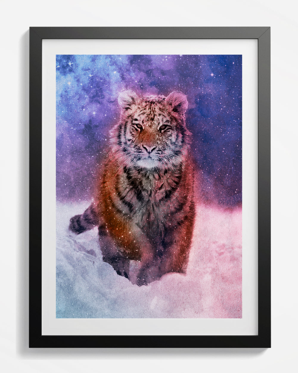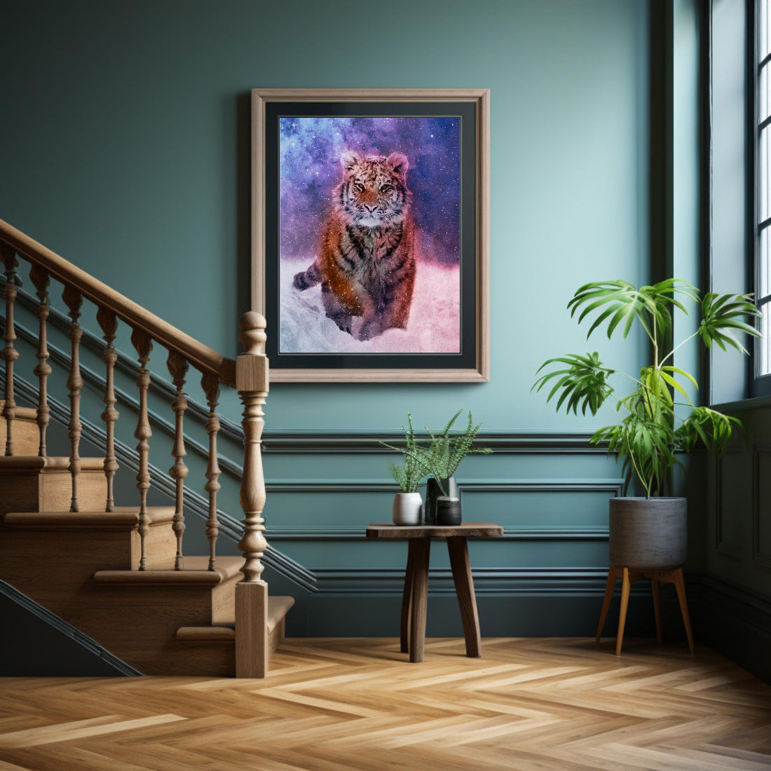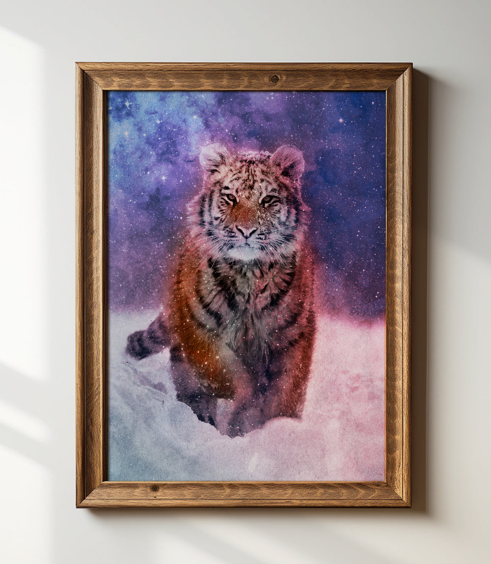 Resilience captures a stunning moment of a tiger charging through snow, its vibrant orange and yellow fur contrasting beautifully with cosmic purples and blues.