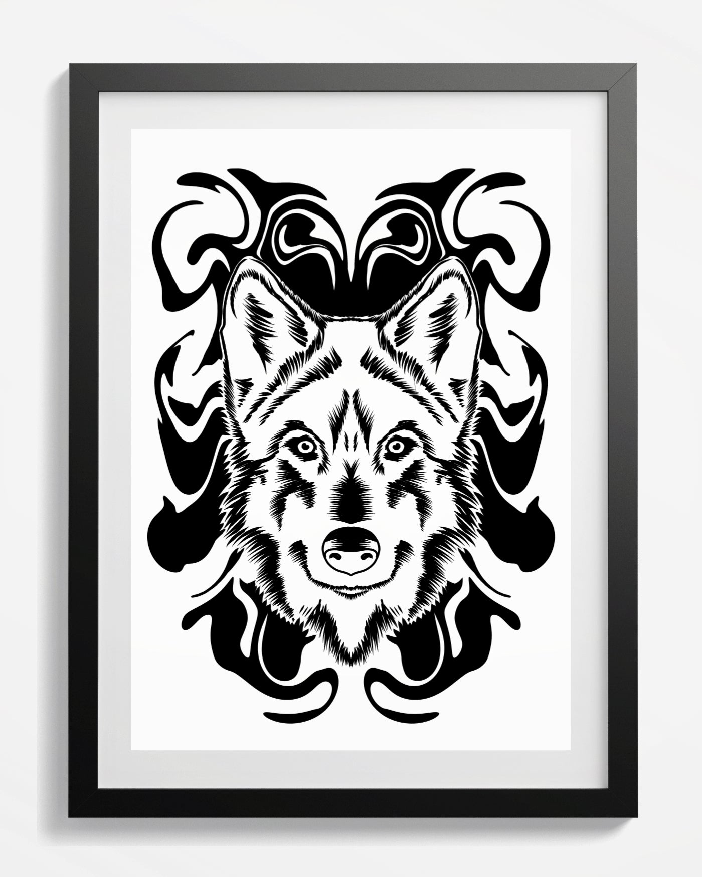 This artwork features a detailed portrait of a wolf, designed with tattoo-inspired motifs for a distinctive touch.
